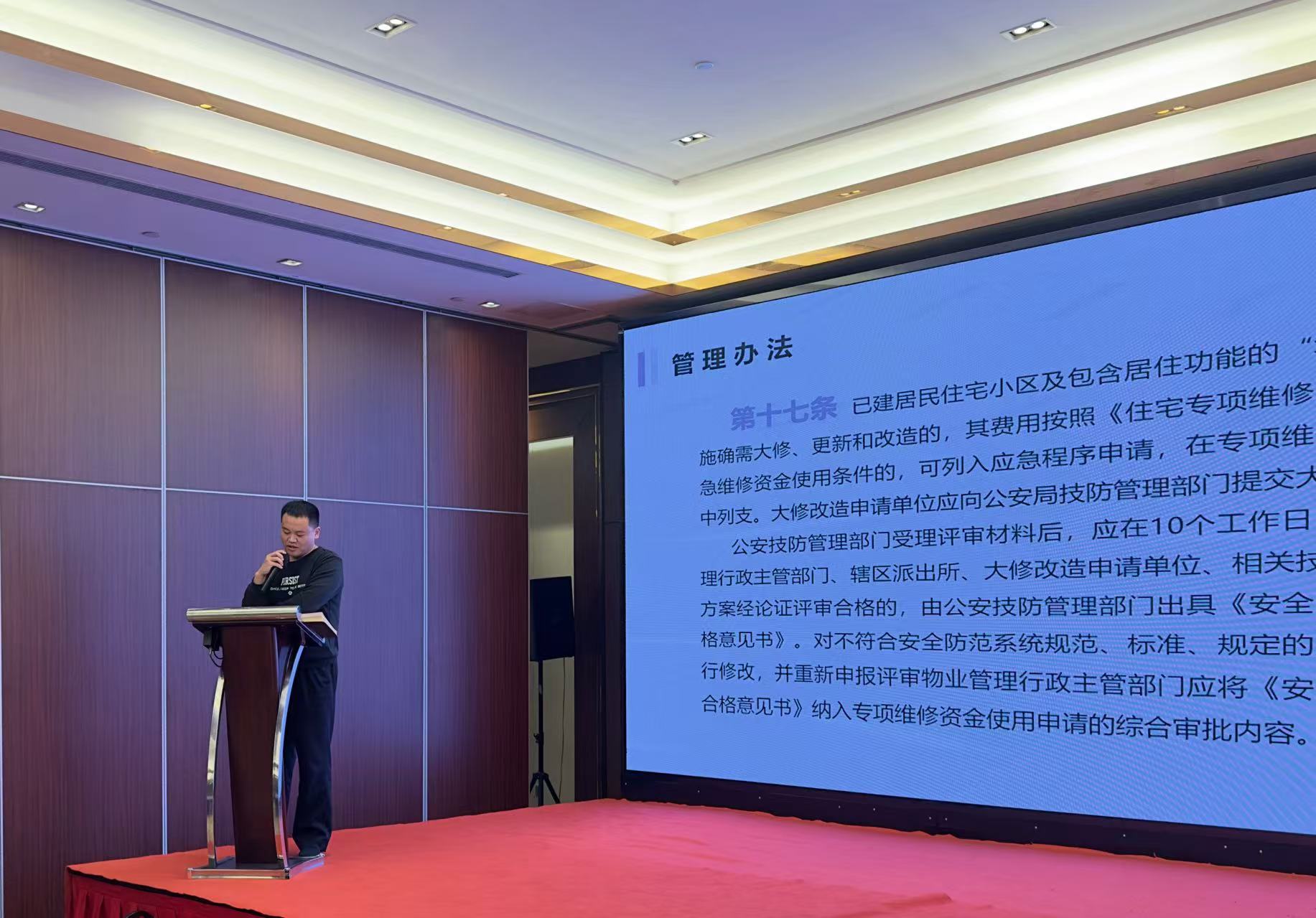 緊接著,常州市公安局金壇分局科信大隊(duì)技術(shù)負(fù)責(zé)同志對(duì)公共場(chǎng)所、居民住宅小區(qū)、商務(wù)辦公樓、城市綜合體安全技術(shù)防范設(shè)施建設(shè)管理辦法進(jìn)行了深入解讀。并結(jié)合多年的工作經(jīng)驗(yàn)和豐富的實(shí)際案例,逐一闡述了各項(xiàng)標(biāo)準(zhǔn)的具體內(nèi)容和要求。他特別強(qiáng)調(diào)了在設(shè)計(jì)論證階段,要充分考慮實(shí)際應(yīng)用場(chǎng)景和需求,確保設(shè)計(jì)方案的科學(xué)性和合理性。并詳細(xì)講解了在施工驗(yàn)收環(huán)節(jié)中的驗(yàn)收標(biāo)準(zhǔn)和流程,分享了多起驗(yàn)收的案例,為參會(huì)者提供了寶貴的參考。此外,他還就如何加強(qiáng)施工管理、提高施工質(zhì)量等方面提出了具體的建議,為會(huì)員單位在實(shí)際操作中提供了有力的支持。